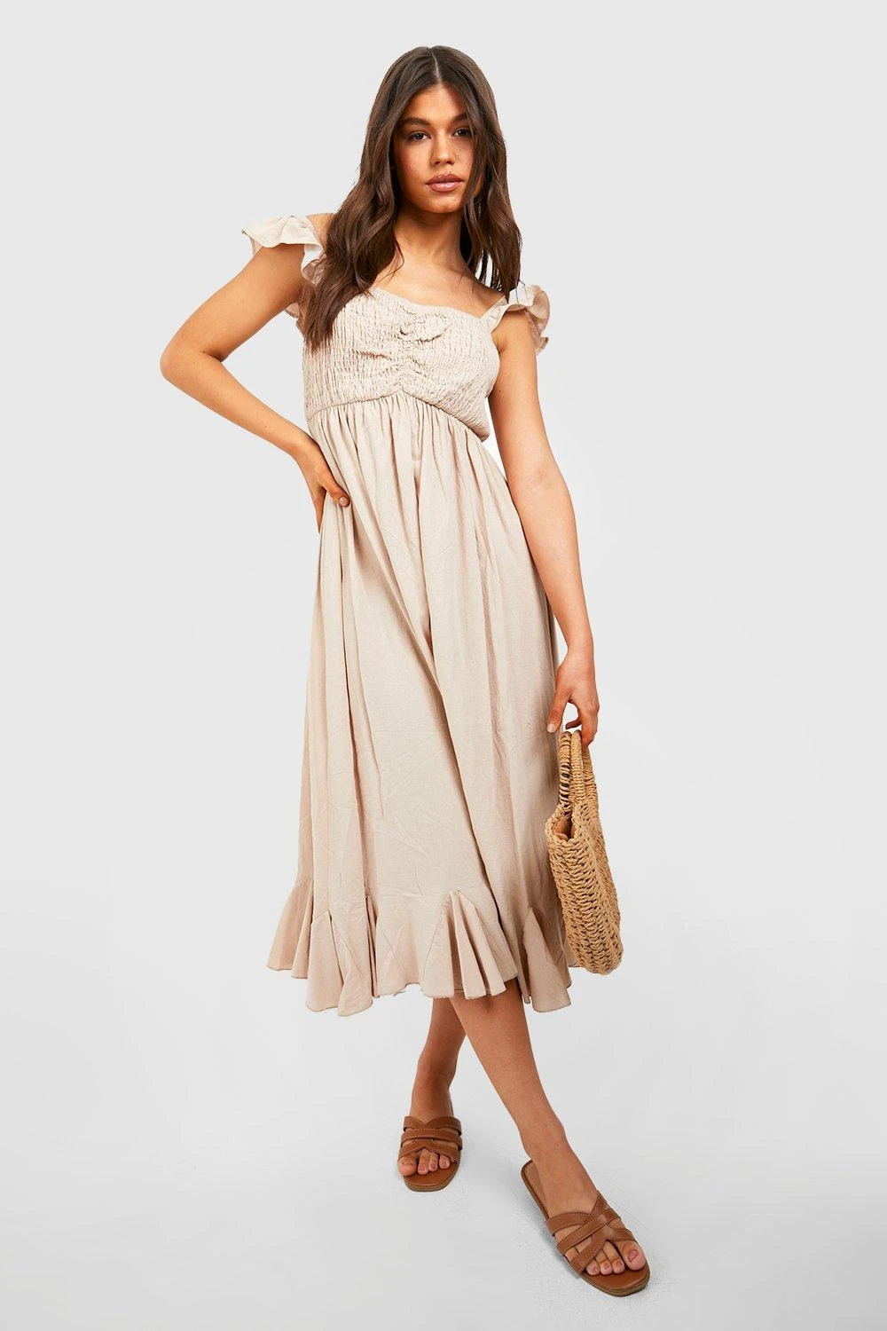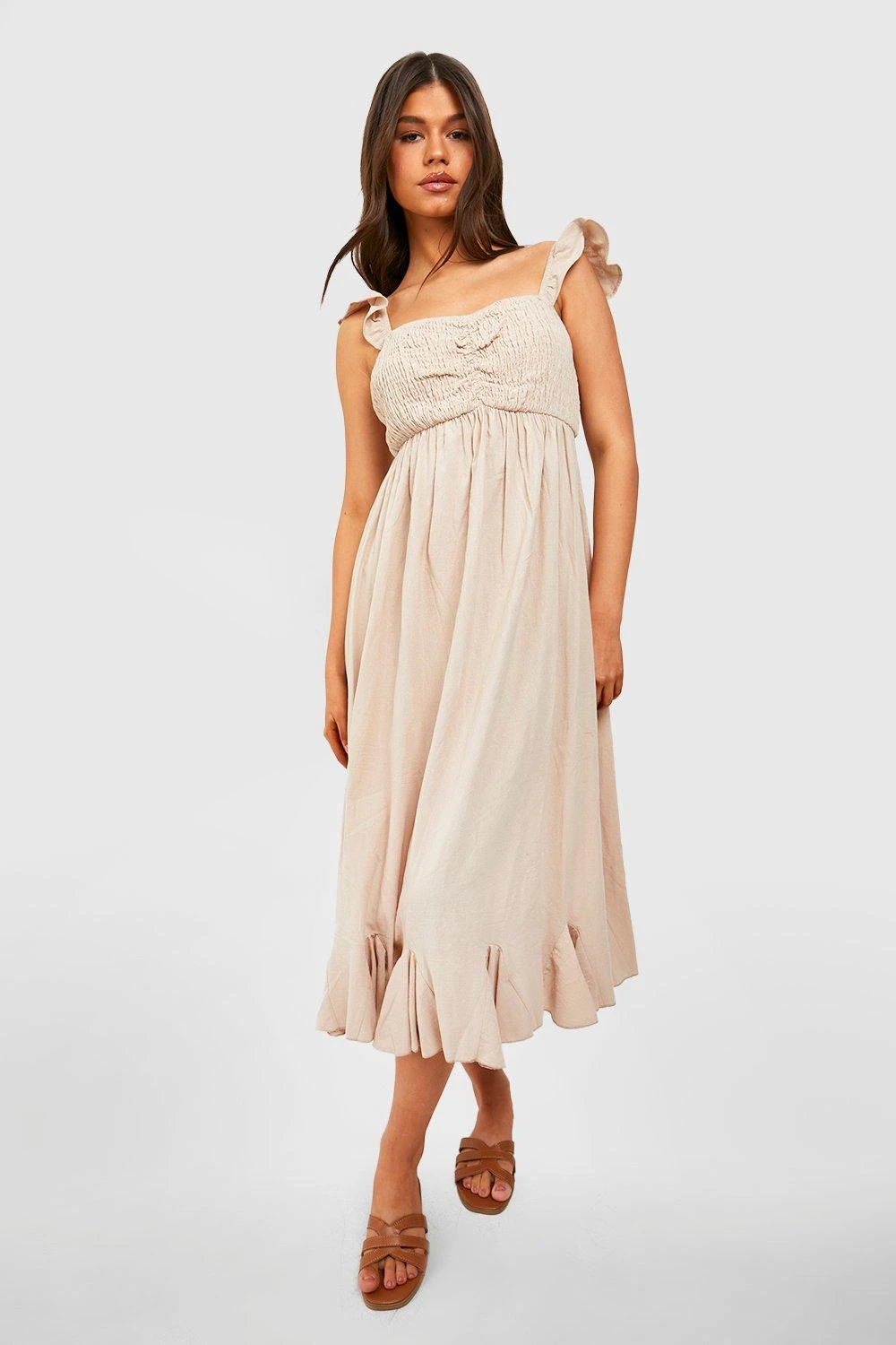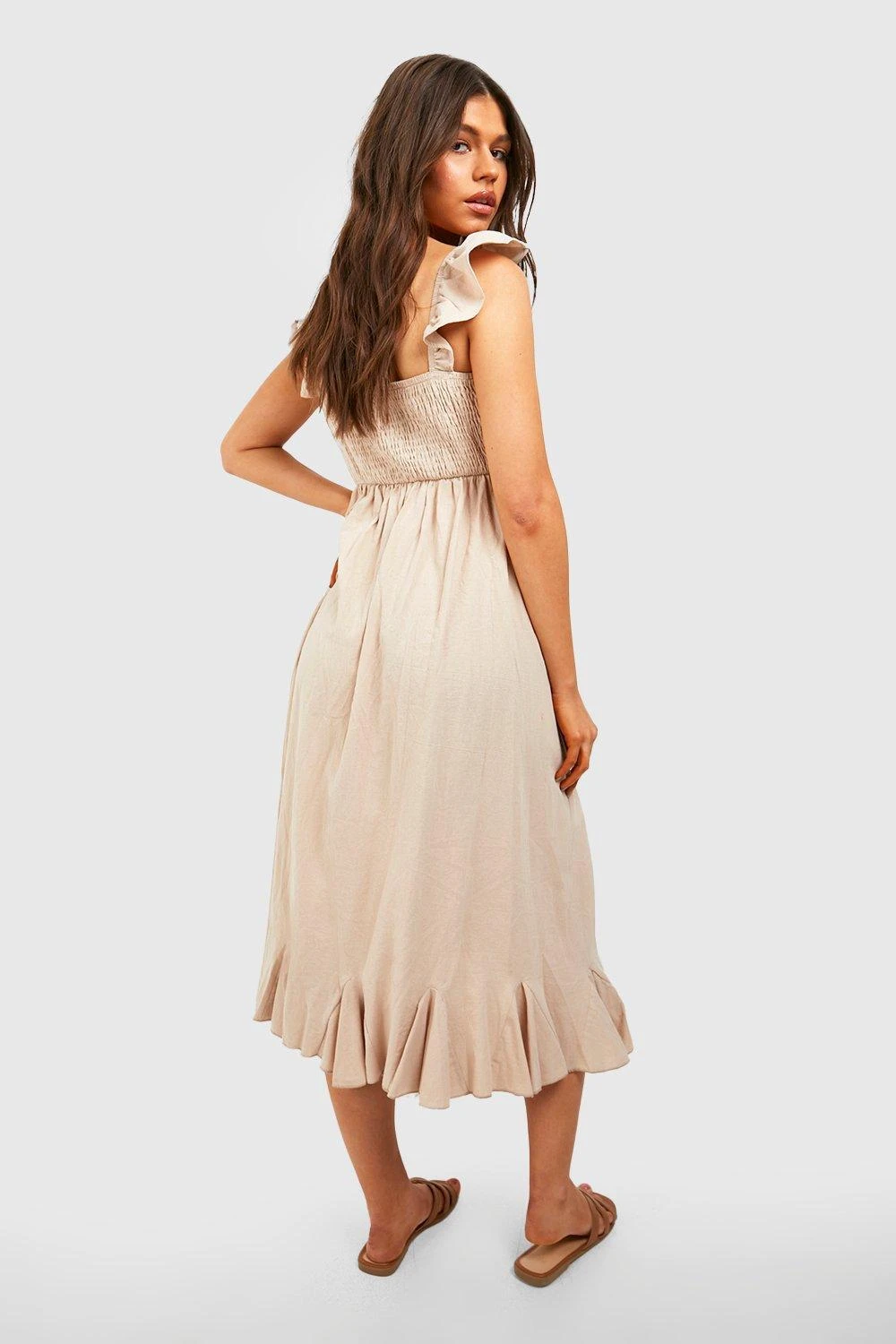 Gerafftes Rüschen-Midikleid Aus Leinen