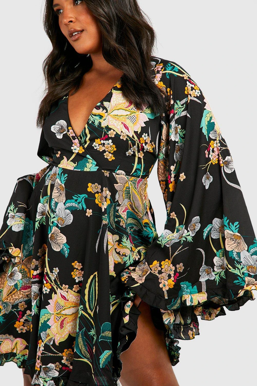 Plus Florales Skaterkleid Mit Weiten Ärmeln
